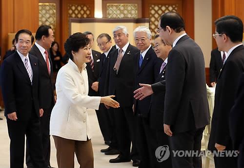 △ 박근혜 대통령이 2014년 10월 24일 청와대에서 일한의원연맹 대표단을 접견하며 인사하는 모습.
