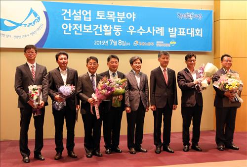 △ SK건설은 고용노동부와 한국산업안전보건공단이 주최?주관하는 건설업 안전보건활동 평가에서 대상인 노동부장관상을 수상했다고 9일 밝혔다. 사진은 권순철(오른쪽 두번째) SK건설 팽성-오성 도로건설공사 현장소장이 시상식에서 기념촬영을 하고 있는 모습. SK건설 제공.