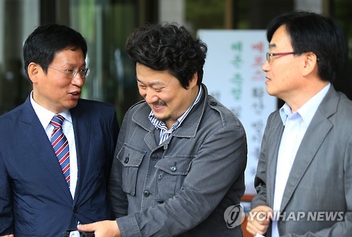 △ 밝은 표정의 이상호 (서울=연합뉴스) 김도훈 기자 = 이상호 전 MBC 기자(가운데)가 9일 오전 서울 서초구 대법원에서 열린 해고무효 소송 상고심 선고공판을 마친 뒤 김환균 언론노조 위원장(왼쪽)과 조능희 언론노조 MBC 본부위원장으로부터 축하를 받고 있다. 이날 대법원은 "해고는 무효이며 2013년 1월부터 복직 때까지 월 400만원을 지급하라"고 판결한 원심을 확정했다.