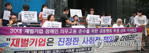 (서울=연합뉴스) 설승은 기자 = 장애인 단체들이 삼성그룹과 LG그룹 등 국내 30대 기업에 대해 장애인 의무 고용률을 지켜줄 것을 촉구하고 나섰다.