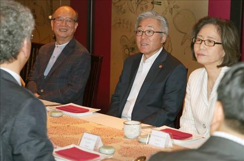 △ 김종덕 문화체육관광부 장관(가운데)이 8일 오후 광화문 한 식당에서 연극계 원로 6명과 오찬을 겸해 이야기를 나누고 있다.