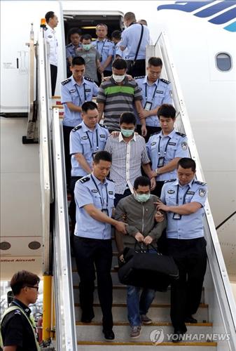 | △ 인도네시아서 체포된 중국의 도피사범들.(AP=연합뉴스 사진자료) |