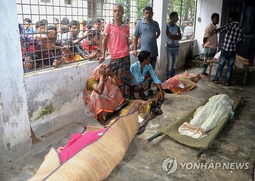 | △ 10일 방글라데시 미멘싱의 대학병원에서 주민들이 이날 오전 옷 나눔 자선행사에서 압사한 이들의 시신 옆에서 애통해하고 있다.(AP=연합뉴스) |