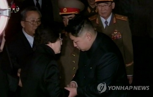 △ 김정은과 이희호 여사 (서울=연합뉴스) 김대중 전 대통령의 부인인 이희호 여사가 다음 달 5∼8일 북한을 방문한다. 남측 김대중평화센터와 북측 아시아태평양평화위원회는 6일 개성에서 실무접촉을 갖고 이희호 여사의 3박 4일간의 평양 방문 일정에 합의했다. 방북 중 김정은 국방위원회 제1위원장 면담 여부와 내용 등이 주목된다. 사진은 2011년 12월 이 여사가 평양 금수산기념궁전을 찾아 김정일 시신에 조문한 뒤 김 위원장과 만나는 모습. (조선중앙TV. 연합뉴스 자료)