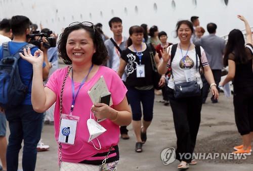 △ '메르스 가고 유커 오고' (인천=연합뉴스) 윤태현 기자 = 9일 오전 인천시 중구 인천항에 정박한 중국 크루즈 '중화태산호'에서 중국 관광객들이 내리고 있다. 이 선박으로 한국에 입국한 중국 관광객 800여명은 이날부터 2박 3일 일정으로 인천지역 곳곳을 둘러볼 예정이다. 2015.7.9 tomatoyoon@yna.co.kr