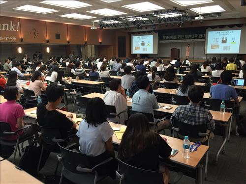 | △ 탈북청년 개최 통일세대 위한 대한민국 현대사 강좌 (서울=연합뉴스) 이대희 기자 = 탈북청년모임 '위드유'(with-U)는 11일 서울 중구 외환은행 대강당에서 '광복 70주년 기념 통일세대를 위한 대한민국 현대사강좌'를 개최했다. 사진은 탈북 청년과 대학생 등 250여명이 참여정부 시절 청와대 홍보수석을 지낸 이화여대 조기숙 교수의 강연을 경청하는 모습. 2015.7.11 2vs2@yna.co.kr |