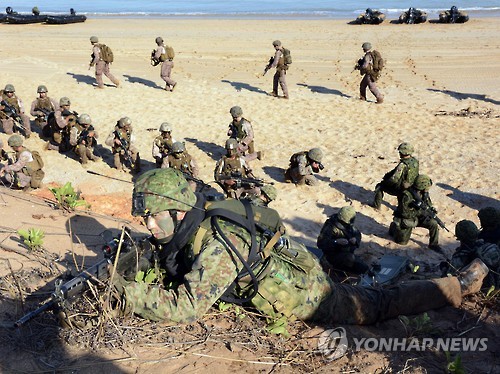 △ (노던 테리토리<호주> 교도=연합뉴스) 11일 호주 북부의 준주(準州)인 노던 테리토리의 포크베이 지역 해안에서 미군과 호주군의 연합군사훈련에 처음 참가한 일본 자위대원이 미국 해병대원과 함께 총기를 들고 섬 탈환 작전을 수행 중이다. 2015.7.12
