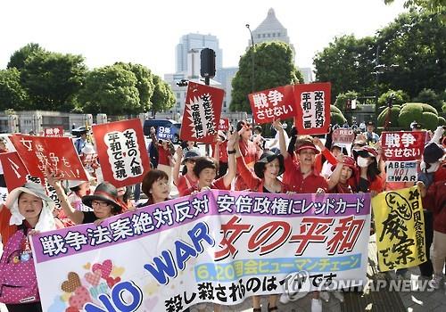 | △ 2015년 6월 20일 '여성의 평화, 6·20 국회 인간사슬'이라는 행사 참가자가 일본 국회 주변에서 안보관련 법안에 반대하는 시위를 벌이고 있다.(교도=연합뉴스 자료사진) |