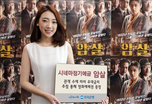 (서울=연합뉴스) 고동욱 기자 = 우리은행[000030]은 영화배급사인 쇼박스[086980]와 마케팅 협약을 맺고 영화 '암살'의 흥행실적에 따라 우대금리를 주는 정기예금을 오는 31일까지 판매한다고 13일 밝혔다.