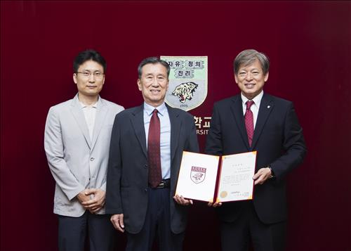 △ 고려대에 10억원을 기부한 유휘성(가운데)씨, 유씨의 차남 선구(왼쪽)씨와 염재호 고려대 총장 << 고려대 제공 >>