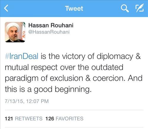 하산 로하니 이란 대통령은 자리프 장관이 트윗을 올린 10분 정도 뒤 "이란 핵협상은 배제와 강압의 구식 패러다임을 누른 외교와 상호 존중의 승리다. 그리고 좋은 시작이다"라는 트윗을 게시했다가 바로 삭제했다.
