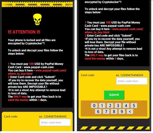 감염 직후 사용자의 스마트폰은 '100달러를 5일 안에 입금하라'는 내용의 문구가 담긴 감염화면으로 바뀌면서 다른 화면으로 전환하는 등의 조작이 불가능해진다.