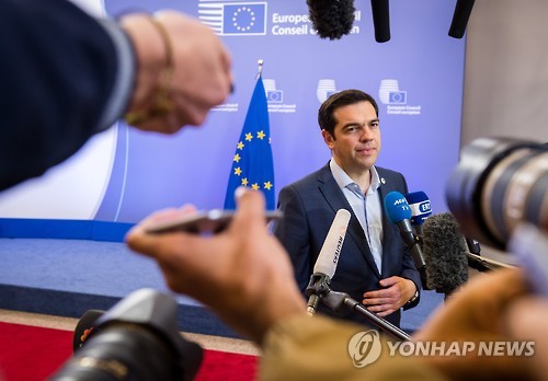 △ 그리스 제3차 구제금융 협상을 위한 유로존 정상회의가 끝난 뒤 알렉시스 치프라스 그리스 총리가 기자회견을 하고 있다.(연합뉴스 사진DB)