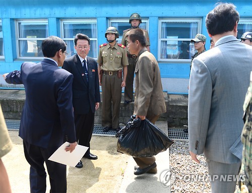 △ 송환되는 북한 선원 (서울=연합뉴스) 지난 4일 울릉도 근해에서 구조된 북한 선원 5명 중 북측으로 돌아가기를 원하는 선원이 14일 판문점을 통해 송환되고 있다. (통일부 제공)