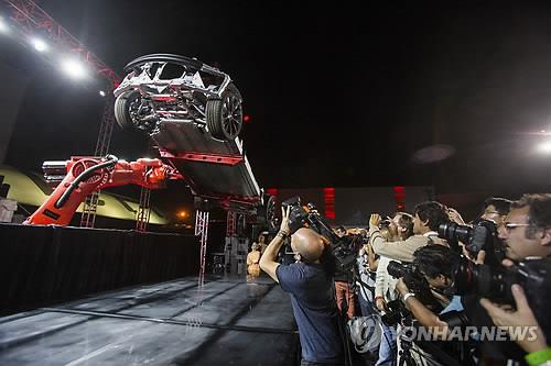 △ (AP=연합뉴스) 미국의 대표적 전기자동차 업체인 테슬라모터스가 9일(현지시간) 미 캘리포니아주 호손에서 신차 '테슬라 D' 발표회를 열고 있다. marshal@yna.co.kr