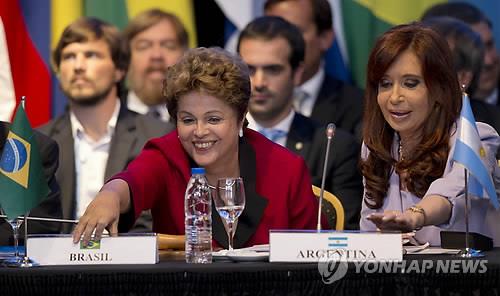 | △ 지난해 말 아르헨티나에서 열린 메르코수르 정상회의에 참석한 지우마 호세프 브라질 대통령(왼쪽)과 크리스티나 페르난데스 아르헨티나 대통령(AP=연합뉴스 자료사진) |