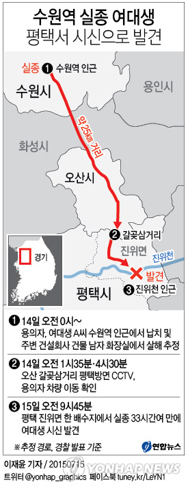 (수원·평택·원주=연합뉴스) 이재현 최해민 류수현 기자 = 경기 수원에서 납치된 20대 여성이 15일 오전 평택시 진위면의 한 배수지에서 숨진 채 발견됐다.