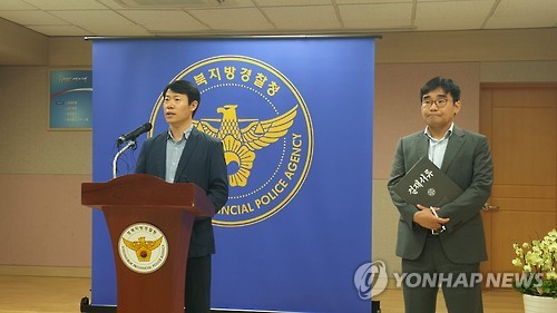 | △ 브리핑하는 경북경찰청 강력계장 (대구=연합뉴스) 손대성 기자 = 15일 경북지방경찰청 소회의실에서 오금식 강력계장이 '상주 음료수 독극물 사건'과 관련해 기자를 상대로 브리핑하고 있다. 2015.7.15 sds123@yna.co.kr |