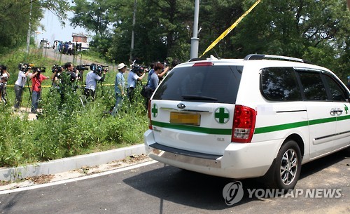 | △ 여대생 시신 발견 현장에 도착한 영안실 차량 (평택=연합뉴스) 류수현 기자 = 15일 경기도 평택시의 한 저수지 인근 야산에서 숨진 채 발견된 A(22·여)씨의 시신을 수습하기 위해 한 영안실 차량이 현장에 들어서고 있다. 2015.7.15 you@yna.co.kr |