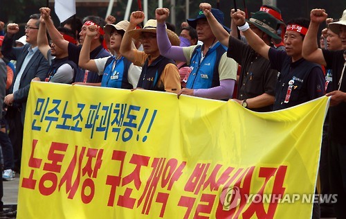 (전국종합=연합뉴스) 민주노총 소속 노동자들이 15일 전국 곳곳에서 집회를 열고 '노동시장 구조 개악 저지' 등을 요구했다.