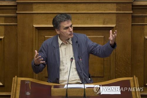 | △ (아테네 AP=연합뉴스) 유클리드 차칼로토스 그리스 재무장관이 15일(현지시간) 의회에 출석해 구제금융 협상 개시 조건인 개혁법안 처리 필요성을 설명하고 있다. |