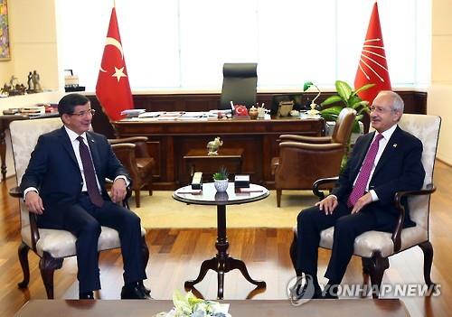 △ (앙카라 AP=연합뉴스) 아흐메트 다부토울루 총리와 제1야당인 공화인민당 케말 클르츠다로울루 대표가 연립정부 구성을 논의하고 있다.