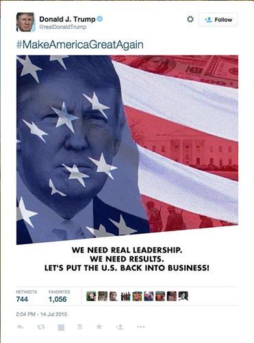 AFP통신, 가디언 등 외신에 따르면 트럼프 선거캠프는 14일(현지시간) 공식 트위터에 '우린 진정한 리더십이 필요하다. 미국 경제를 다시 돌아가게 하자'는 문구와 함께 성조기와 트럼프의 얼굴을 합성한 사진을 올렸다.