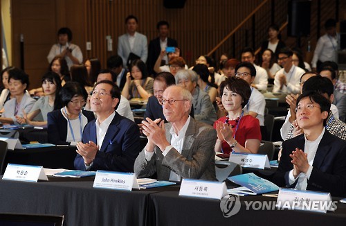 | △ 서울창조경제 국제콘퍼런스 (서울=연합뉴스) 박원순 서울시장과 영국의 경영전략가 존 호킨스 등이 16일 오전 서울시청 다목적홀에서 '지속가능한 혁신: 가치의 재창조'를 주제로 열린 서울창조경제 국제콘퍼런스에서 박수를 치고 있다. (서울시 제공) |