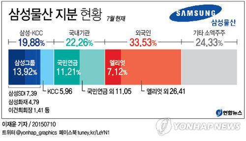 삼성그룹의 삼성물산 지분은 삼성SDI(7.39%), 삼성화재(4.79%), 이건희 회장(1.41%) 등 계열사와 특수 관계인까지 합쳐 13.92%다. 여기에 '백기사'인 KCC의 지분 5.96%를 더하면 19.88%다.