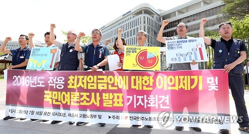 | △ 양대노총, 최저임금 이의제기 기자회견 (세종=연합뉴스) 배재만 기자 = 최저임금위원회 민주노총과 한국노총 소속 근로자위원들이 16일 오전 정부세종청사 고용노동부 앞에서 2016년 적용 최저임금 결정에 대해 이의를 제기하며 재심의를 요청하고 있다. 이들은 2016년 적용 최저임금안 고시가 절차상 내용상 심각한 위법성을 지니고 있다며 고용노동부 장관에게 재심의하도록 최저임금위원회에 요청할 것을 제기했다. |
