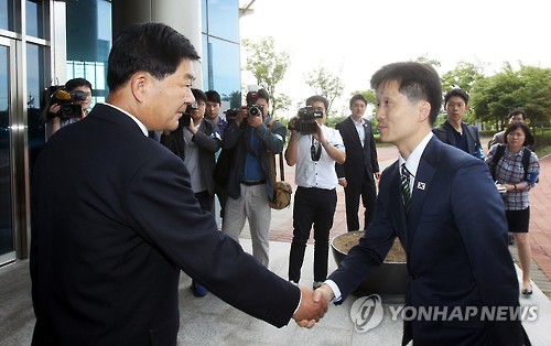 이상민 통일부 남북협력지구발전기획단장 등 남측 대표단 5명이 공동취재단과 함께 회담이 열리는 개성공단 종합지원센터에 도착하자 박철수 중앙특구개발지도총국 부총국장 등 북측 대표단이 맞이했다.