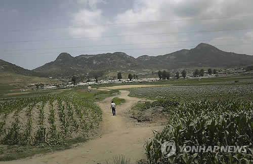 △ 북한이 100년만의 극심한 가뭄에 시달리고 있는 가운데 지난달 23일(현지시간) 평안남도 남포시 주민이 옥수수밭 사이로 걸어가고 있다. (AP=연합뉴스)