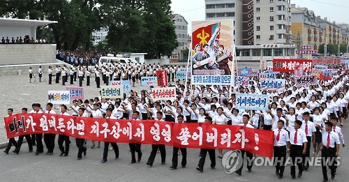△ 북한 '반미투쟁' 군중대회 (평양 조선중앙통신=연합뉴스) 25일 북한 각 지역에서 '6·25 미제 반대 투쟁의 날' 군중대회가 열리고 있다. 조선중앙통신은 이 사진을 보도하며 정확한 촬영장소를 밝히지 않았다. 2015.6.26 photo@yna.co.kr