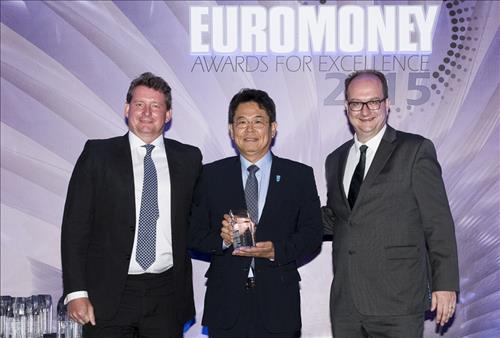 △ (서울=연합뉴스) 하나은행이 16일 홍콩 샹그릴라호텔에서 개최된 유로머니(Euromoney)지의 'Awards for Excellence 2015'에서 '대한민국 최우수 은행(Best Bank in Korea)'으로 3년 연속 선정됐다. 김병호 하나은행장(사진 가운데)이 토니 새일 유러머니지 아시아 CEO(사진 왼쪽), 클리브 호우드 유러머니지 편집장(사진 오른쪽)과 함께 기념촬영을 하고 있다. <<하나은행 제공>>