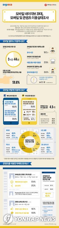 (서울=연합뉴스) 윤보람 기자 = 우리나라 20대는 하루 평균 모바일을 3시간 44분 동안 이용하며 짧고 가벼운 모바일 콘텐츠를 더 선호하는 것으로 나타났다.