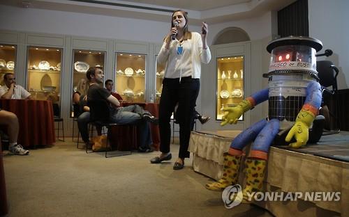 △ 16일 메사추세츠 주 세일럼의 피보디 에섹스 박물관에서 공동 개발자인 프라우케 젤러 교수가 히치봇을 소개하고 있다. (AP=연합뉴스)