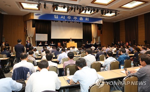 | △ 삼성물산 주총…합병안 통과 (서울=연합뉴스) 17일 오전 서울 서초구 양재동 aT센터에서 제일모직과의 합병계약 안건을 주주 결의에 부치는 임시 주주총회가 열리고 있다. 삼성물산과 제일모직의 합병안은 이날 통과됐다. (삼성물산 제공) |