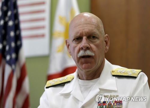| △ (AP=연합뉴스) 스콧 스위프트 미군 태평양함대사령관이 지난 17일 필리핀 마닐라에서 기자들과 인터뷰하고 있다. |