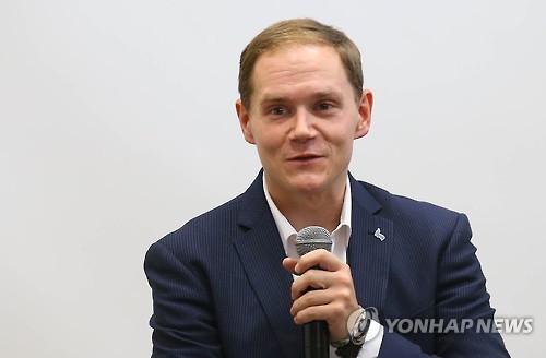 | △ 19일(현지시간) 오후 유라시아 친선특급 행사에 참가한 평양주재 독일 대사관 얀 야노프스키 2등 서기관이 러시아 이르쿠츠크 메리어트 호텔에서 기자회견을 하고 있다. |