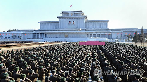 | △ 북한은 광복 70주년을 맞아 다음달 13∼15일 민족통일대회를 연다고 조선중앙통신이 19일 보도했다. 사진은 지난 2월 대규모 결의대회를 연 북한군의 모습.(연합뉴스 자료사진) |