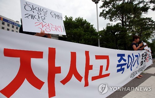 | △ 자사고 지정취소 미림여고 학부모 입장 발표 (서울=연합뉴스) 홍해인 기자 = 미림여고 학부모들이 20일 오전 서울 신문로2가 시교육청 앞에서 이날 교육청의 자립형 사립고 지정 취소 결정에 대한 입장을 발표하고 있다. |