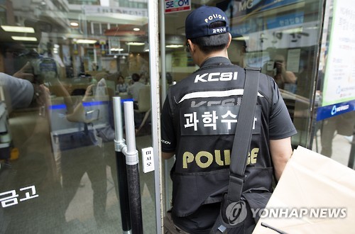 | △ 사고현장 들어서는 과학수사대원들 (서울=연합뉴스) 윤동진 기자 = 20일 오후 강도가 침입한 서울 서초구 잠원동 새마을금고에 과학수사대원들이 들어서고 있다. 경찰은 30대로 추정되는 남성이 새마을금고에 들어와 권총으로 보이는 물건으로 직원을 위협해 500만∼600만원을 챙겨들고 도주했다고 밝혔다. |