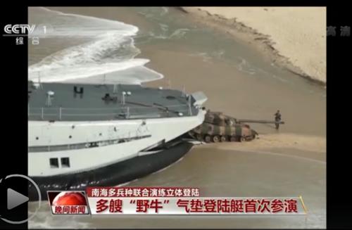 △ 중국해군의 남중국해 상륙훈련 장면. 대형 공기부양선에 실린 탱크들이 상륙작전을 시도하고 있다. <<CCTV 화면 캡처>>