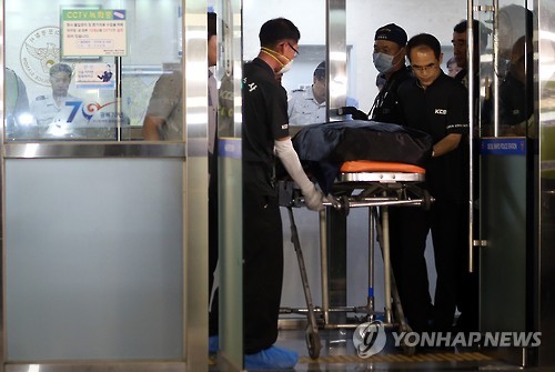 | △ 지구대 떠나는 시신 (서울=연합뉴스) 신준희 기자 = 경찰 초급 간부가 지구대 건물에서 권총에 맞아 숨진 채 발견돼 경찰이 수사에 나섰다. 20일 경찰에 따르면 이날 오후 2시 45분께 서울 마포경찰서 홍익지구대 2층 탈의실에서 머리에 피를 흘리고 있던 A 경위(31)를 순찰을 마치고 돌아온 또 다른 지구대 경찰관이 발견, 119에 신고했다. 이날 오후 과학수사대 수사관들이 현장에서 시신을 실어 구급차로 옮기고 있다. |