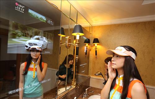 (서울=연합뉴스) 한지훈 기자 = LG유플러스[032640]는 거울에 비치는 영상으로 정보를 제공하고 광고도 할 수 있는 '미러 미디어'를 전국 골프장 100여곳에 설치했다고 21일 밝혔다.