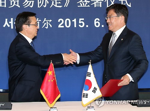 | △ 지난 6월 윤상직 산업통상자원부 장관과 가오후청 중국 상무부장이 한-중 자유무역협정(FTA)을 서명한 후 악수하는 모습. |