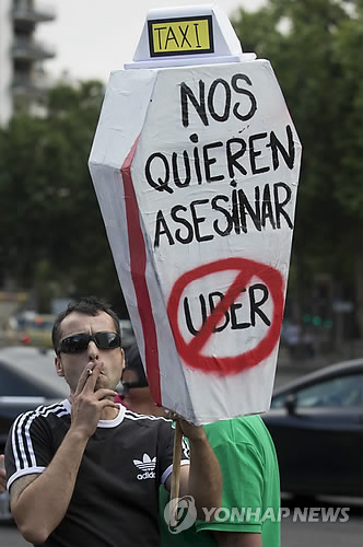 △ 지난 6월11일 한 남성이 스페인 마드리드에서 우버의 불공정 경쟁에 항의하는 시위를 벌이는 모습(연합뉴스 사진DB) FILE - In this June 11, 2014 file photo, a demonstrator carries a mock coffin with a message reading 'They want to kill us - Uber' during a 24 hour taxi strike and protest in Madrid, Spain against unregulated competition from private companies, in particular, Uber. A judge has ordered the precautionary suspension of the ridesharing service Uber in Spain on Tuesday Dec. 9, 2014, saying it represents unfair competition. The suspension had been sought by Madrid’s Taxi Association, which is planning a legal case against Uber which allows passengers to hail a ride from a mobile app. The company takes a cut from what the drivers charge. Taxi drivers say such services are unfair as the drivers do not have to fulfill the same requirements or pay tens of thousands of euros (dollars) for training and licences as taxi drivers do. The San Francisco-based company has met with opposition in other European Union countries. (AP Photo/Paul White, File)