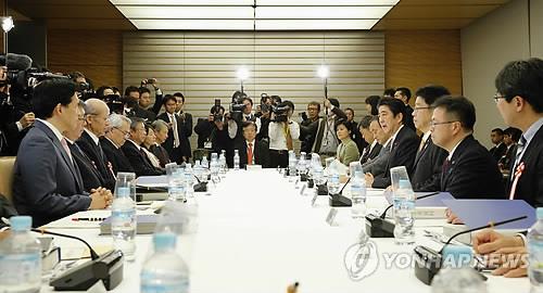 | △ '20세기 구상 간담회'가 2015년 2월 25일 도쿄 총리 관저에서 아베 총리와 스가 요시히데(菅義偉) 관방장관 등이 참석한 가운데 첫 회의를 개최하는 모습. (교도=연합뉴스 자료사진) |