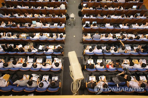 | △ 인터넷 전문은행 인가심사기준 설명회 (서울=연합뉴스) 이정훈 기자 = 22일 오후 서울 영등포구 여의대로 금융감독원에서 열린 인터넷 전문은행 주요 인가심사기준 설명회를 찾은 금융업계 관계자들이 이윤수 금융위원회 은행과장의 인사말을 경청하고 있다. |