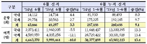 6월 항공여객은 599만5천여명으로 작년 같은달 대비 10% 감소했다.